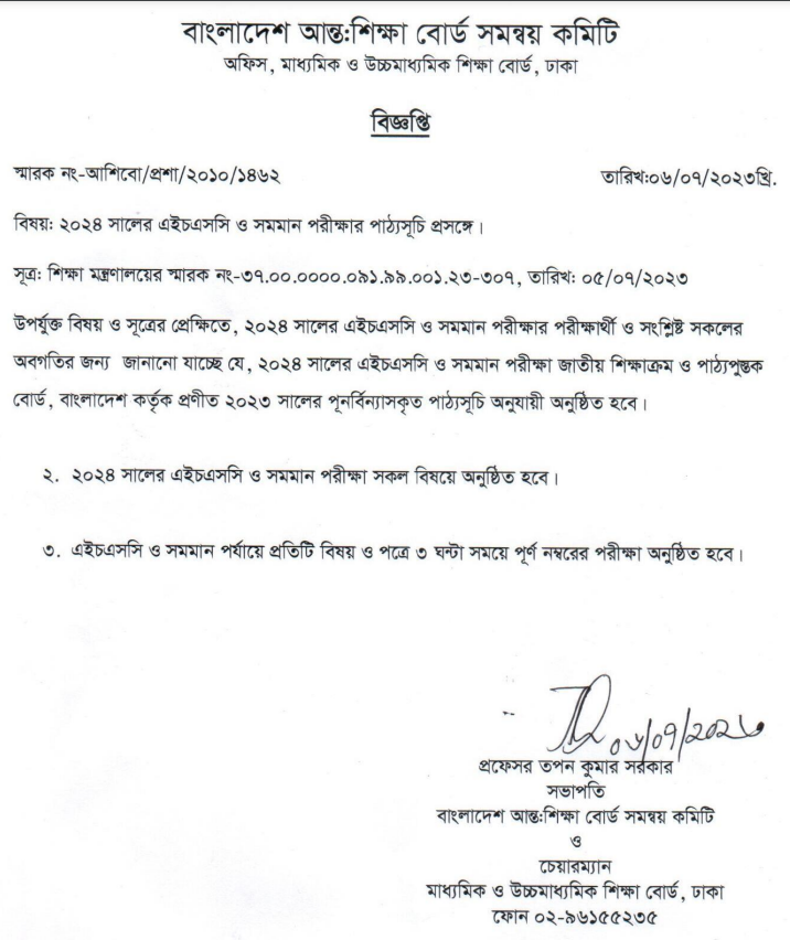The HSC exam of 2024 will also be held on the short syllabus of 2023, the Ministry of Education said. The exam will be held in 100 marks of 3 hours but the exam is based on short syllabus.